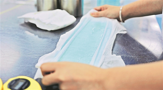 布班迪研發(fā)團(tuán)隊(duì)對(duì)新品紙尿褲進(jìn)行性能測(cè)試。