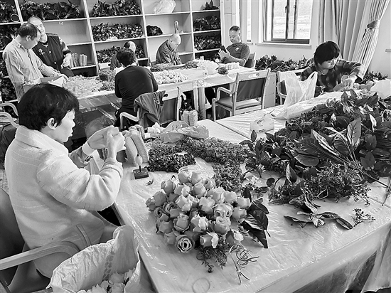 圖為“馨橋工療”共富工坊員工正在制作插花。
