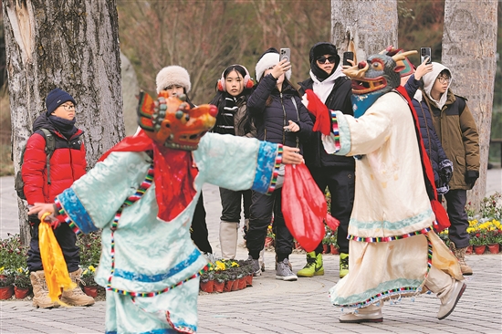 12月7日,在九寨溝景區(qū),游客觀賞藏戲表演。當(dāng)日,2024四川省冬季旅游啟動(dòng)儀式在位于阿壩藏族羌族自治州的九寨溝舉行,正式拉開(kāi)“冬游四川”火熱大幕,將開(kāi)展5000場(chǎng)文旅活動(dòng),發(fā)放1.5億元文旅大禮包,以?xún)?yōu)質(zhì)暖心服務(wù)邀請(qǐng)廣大游客到四川旅游。 新華社記者 沈伯韓 攝