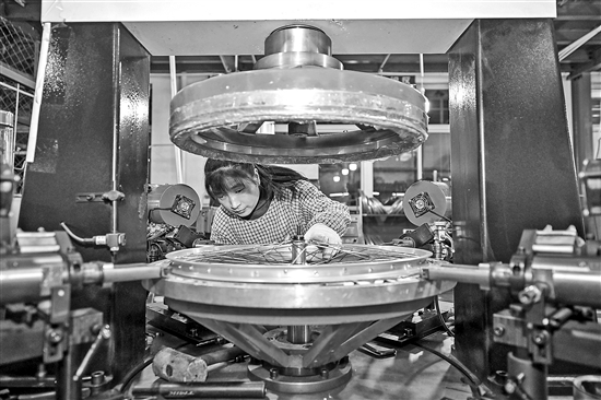 12月6日,在天津市武清區(qū)王慶坨鎮(zhèn)利雅得公司,工人在車間內(nèi)操作機(jī)器生產(chǎn)自行車零部件。