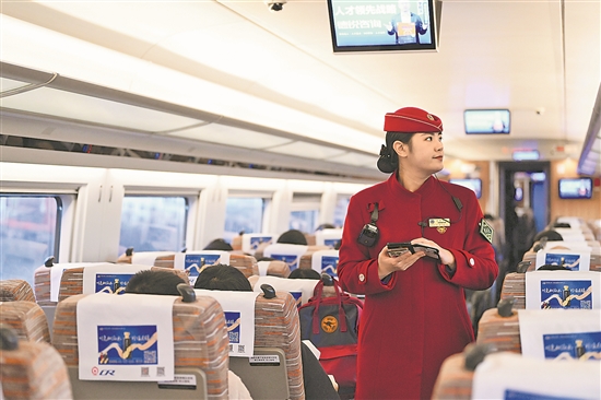 12月10日,京津城際C2002次列車長白蕊在車廂內(nèi)巡視。當日,京津城際實施新的列車運行圖,優(yōu)化京津兩地早晚高峰列車開行方案。新華社記者 李然 攝