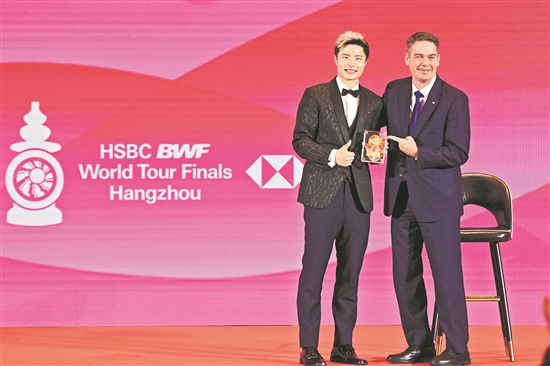 世界羽聯(lián)主席拉爾森為中國選手石宇奇(左)頒獎(jiǎng)。新華社記者 黃宗治 攝