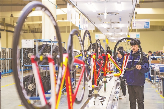 12月12日,山東省樂陵市經(jīng)濟開發(fā)區(qū)一體育用品生產(chǎn)企業(yè),工人在碳纖維自行車生產(chǎn)線上趕制一批出口海外的訂單。
