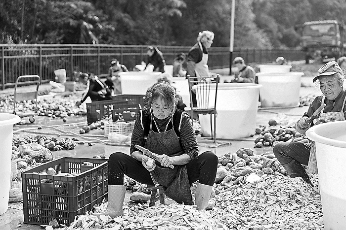 近日,浙江省衢州市常山縣新昌鄉(xiāng)“西源番薯”共富工坊種植的紅薯迎來豐收季。一顆顆紅薯擺滿田間地壟,村民忙著將剛挖出來的紅薯分揀、裝袋,田間地頭一派繁忙景象。今年,當?shù)丶t薯產(chǎn)量20萬千克,預計將為村集體帶來60萬元的收益。本報通訊員 李君平 攝