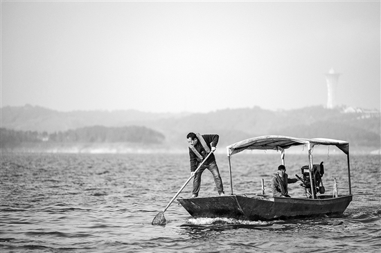 丹江口水庫(kù)是南水北調(diào)中線工程的重要水源地。今年58歲的楊力是土生土長(zhǎng)的湖北丹江口人,在庫(kù)區(qū)從事清漂工作已有7年多,現(xiàn)在是清漂隊(duì)隊(duì)長(zhǎng)。天色微明之時(shí),他與3名隊(duì)員分別駕駛兩艘小船,駛?cè)霂?kù)區(qū),開始清漂作業(yè)。從碼頭到他們負(fù)責(zé)的最遠(yuǎn)水域,開船單程需要4個(gè)小時(shí)。