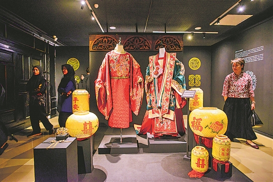 “歷久彌新的漢服與中國紋樣展”近日在馬來亞大學亞洲藝術博物館舉辦。作為慶祝中馬建交50周年和馬來亞大學孔子學院成立15周年系列活動之一,本次展覽由馬來亞大學孔子學院主辦,展品涵蓋從秦漢到明代各個歷史時期的代表性漢服,呈現(xiàn)出豐富的美學和文化內(nèi)涵。圖為近日,在馬來西亞吉隆坡,觀眾在展覽現(xiàn)場觀賞展出的漢服。
