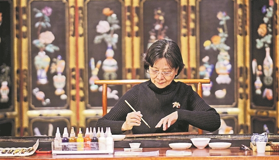 1957年出生的胡昕從事金漆鑲嵌工藝已有48年,她潛心研究,在工藝技法和藝術(shù)風(fēng)格上實現(xiàn)了新的突破,其創(chuàng)作的金漆鑲嵌作品富麗華貴、莊重典雅、紋飾精美。2015年,胡昕所在的北京金漆鑲嵌有限責(zé)任公司(原北京金漆鑲嵌廠)與北京市工藝美術(shù)高級技工學(xué)校簽訂了“校企合作”協(xié)議,開辦了金漆鑲嵌專業(yè)定向班,建立了“金漆鑲嵌人才培養(yǎng)實訓(xùn)基地”。胡昕作為客座教師,每周都會去現(xiàn)場授課,為企業(yè)培養(yǎng)新一代技術(shù)人才。2019年初,胡昕成立工作室,逐步形成了產(chǎn)品研發(fā)、技藝傳承、人才培養(yǎng)三者有機(jī)結(jié)合、相互促進(jìn)的傳承創(chuàng)新發(fā)展體系,為金漆鑲嵌技藝的傳承培養(yǎng)了大批后續(xù)力量。圖為胡昕在工作室內(nèi)創(chuàng)作(12月10日攝)。新華社記者 李欣 攝