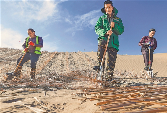 工人在新疆和田地區(qū)民豐縣后河壩沙漠阻擊區(qū)補扎草方格。近日,在新疆于田縣,環(huán)繞塔克拉瑪干沙漠邊緣全長3046公里的綠色阻沙防護帶實現(xiàn)全面鎖邊“合龍”。數(shù)十萬人40余載奮斗,終在大漠邊緣筑起一道綠色長城。新華社記者 王菲 攝