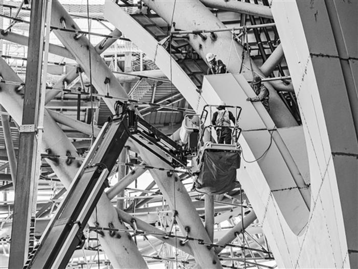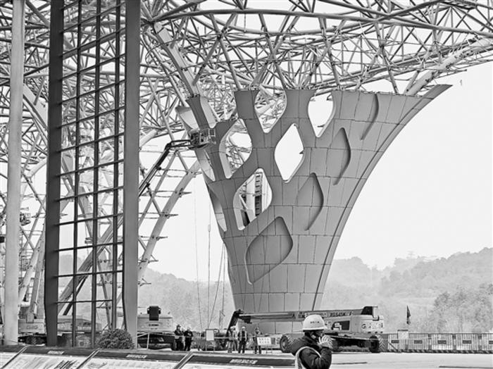 近日,我國西部地區(qū)最大高鐵樞紐——重慶東站站房“黃桷參天”造型驚艷亮相。如何在離地42米的高空上,將1000多塊厚度為3毫米、面積為3平方米、弧度各異的不銹鋼面板,轉(zhuǎn)變?yōu)橐豢么謮训狞S桷樹干?中鐵建工集團(tuán)重慶東站樹形柱安裝工劉朝陽創(chuàng)新采取擴(kuò)大“樹冠葉片”面積方案,不僅成功解決了3毫米厚不銹鋼板分縫拼接難點(diǎn),還避免了材料脹縮引起的鼓包等問題,且“黃桷樹”葉片鏤空效果更加具美感,完美完成“高空拼積木”這一絕活。