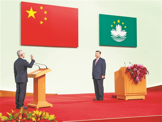 習近平出席并發(fā)表重要講話 澳門特別行政區(qū)第六任行政長官岑浩輝及特別行政區(qū)政府主要官員等宣誓就職 習近平指出,澳門回歸祖國25年來,具有澳門特色的“一國兩制”實踐取得巨大成功,澳門發(fā)生翻天覆地的變化,國際影響力大幅提升。希望新一屆澳門特別行政區(qū)政府團結帶領社會各界,搶抓機遇、銳意改革、擔當作為,更好發(fā)揮“一國兩制”制度優(yōu)勢,不斷開創(chuàng)“一國兩制”事業(yè)高質量發(fā)展新局面