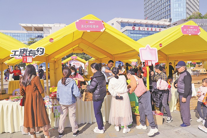 12月21日,由福建省廈門市總工會(huì)聯(lián)合多家單位共同舉辦的“雙愛(ài)同心 和諧共贏”工會(huì)會(huì)員服務(wù)日活動(dòng)在廈門市工人文化宮舉行。全總廈門火炬高技術(shù)產(chǎn)業(yè)開發(fā)區(qū)蹲點(diǎn)干部、“雙愛(ài)典范”企業(yè)代表、新就業(yè)形態(tài)勞動(dòng)者、愛(ài)心企業(yè)、特惠商戶等600人共赴工“惠”之約。112戶特惠商家入駐集市,為職工提供“衣、食、住、行、游、娛、購(gòu)”全方位的消費(fèi)服務(wù)。
