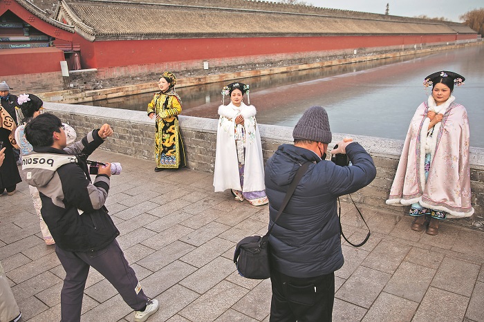 12月19日,北京,游客身著古裝在故宮東門外的筒子河邊拍照打卡。