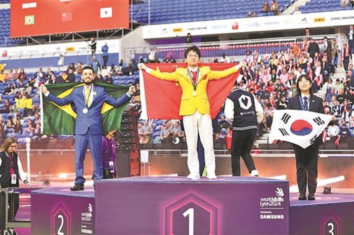 當(dāng)?shù)貢r間2024年9月15日晚,第47屆世界技能大賽在法國里昂閉幕,卓嘉鵬(中)獲得工業(yè)設(shè)計技術(shù)項目金牌。新華社發(fā)