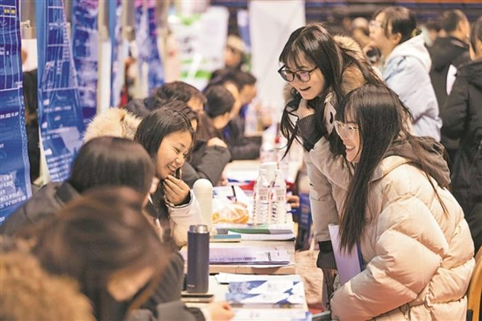 12月23日,在黑龍江大學(xué)2025屆畢業(yè)生冬季供需見面洽談會現(xiàn)場,求職者與招聘方代表溝通。據(jù)悉,本次招聘會參會企業(yè)187家,提供就業(yè)崗位8000余個。