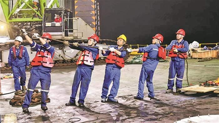 近日,由中交一航局總承包分公司承建的海南省重點(diǎn)能源工程項(xiàng)目——大唐海南儋州120萬千瓦海上風(fēng)電項(xiàng)目一場(chǎng)址海上升壓站上部組塊吊裝完成,標(biāo)志著其承建的項(xiàng)目一場(chǎng)址一標(biāo)段主體工程全部完工。該項(xiàng)目全容量投產(chǎn)后,將對(duì)推進(jìn)海南“清潔能源島”建設(shè)具有重大意義。圖為安裝工人在牽拉纜風(fēng)繩,協(xié)助風(fēng)機(jī)葉片對(duì)位。劉家暉 李小康 攝