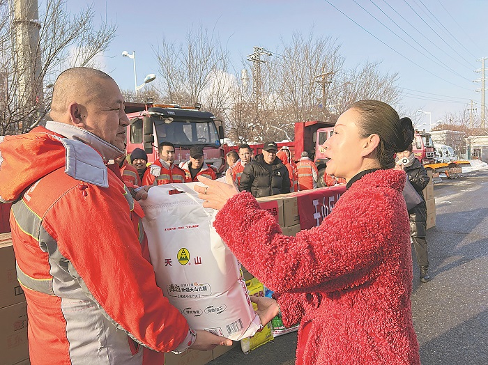 12月22日,新疆烏魯木齊天山區(qū)總工會(huì)開(kāi)展“兩節(jié)”送溫暖活動(dòng),為2100余名環(huán)衛(wèi)工人送去了大米、面粉、食用油等慰問(wèn)品。本報(bào)記者 吳鐸思 本報(bào)通訊員 迪麗胡瑪爾·阿力甫 攝