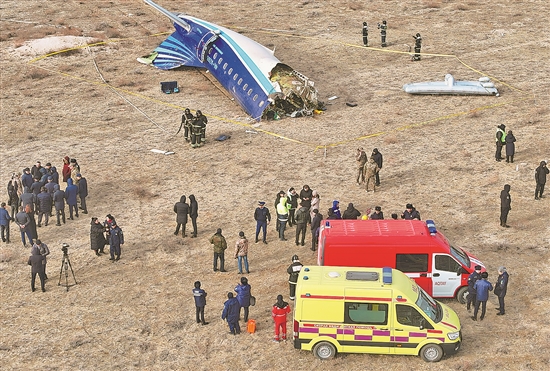 圖為當(dāng)?shù)貢r(shí)間12月25日在哈薩克斯坦阿克套市附近拍攝的墜機(jī)現(xiàn)場(chǎng)(無(wú)人機(jī)照片)。