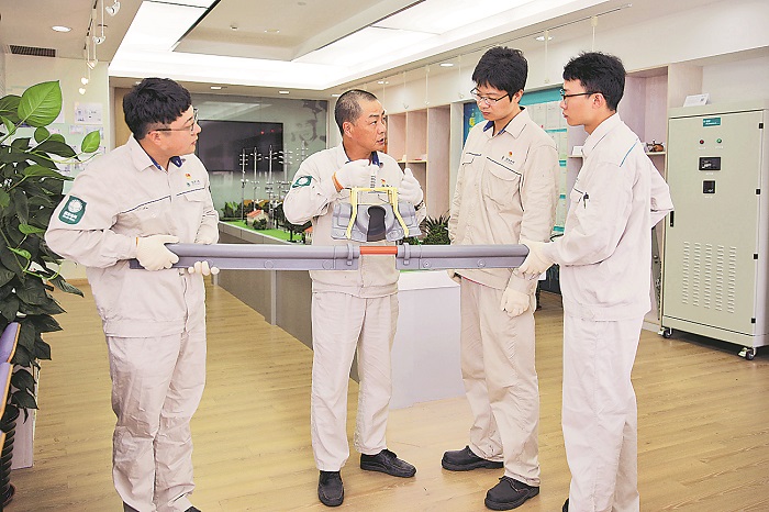 錢忠(左二)在勞模工作室與徒弟們一同制作新型絕緣遮蔽罩。