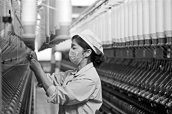 苗錦霞正在給紗線接頭。王偉偉 攝