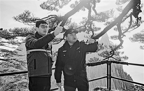 近日,“守松人”胡曉春(右)和黃山風景區(qū)管委會園林局高級工程師吳貽軍討論迎客松生長情況。