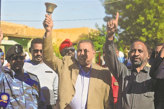 圖為當?shù)貢r間12月28日,在蘇丹北方州棟古拉市一處考點,北方州州長阿卜丁·阿瓦達拉搖鈴示意證書考試開始。