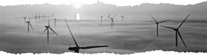 山東榮成,海上風(fēng)電場(chǎng)日出時(shí)分云霧飄渺,宛如仙境。視覺(jué)中國(guó) 供圖