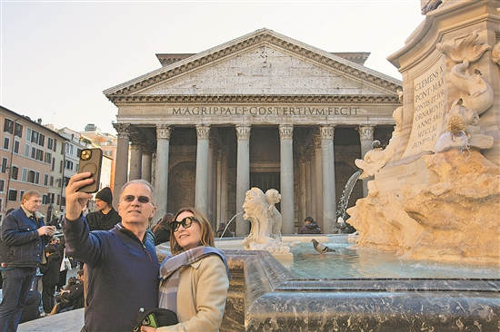 新年到來之際,意大利羅馬多處知名建筑、景點持續(xù)數(shù)月的修繕翻新工程結束,陸續(xù)對游客開放。圖為近日,人們在意大利羅馬參觀翻新后的萬神殿噴泉。新華社記者 李京 攝