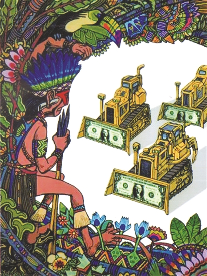 面對金錢推土機,落后地區(qū)的土著人群無法保住家園…… 畫家呼吁人們關(guān)注這些遭受不公平待遇的人群,讓人類共享文明和美好。