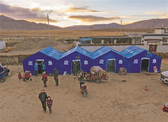 1月7日,在西藏日喀則市拉孜縣曲下鎮(zhèn)土林村,受災群眾搬入應急帳篷。