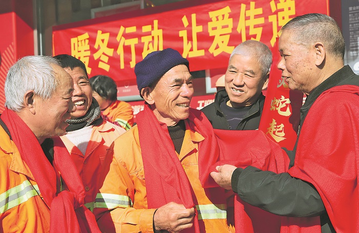 1月2日,浙江省臺州市路橋區(qū)橫街鎮(zhèn)的老干部為環(huán)衛(wèi)工人、快遞小哥送上圍巾等御寒物品。當(dāng)日,路橋區(qū)橫街鎮(zhèn)組辦、鎮(zhèn)總工會連同路橋工商銀行橫街支行開展“暖冬行動 讓愛傳遞”活動,為戶外勞動者送上圍巾、手套、棉帽以及春聯(lián)等。本報通訊員 蔣友青 攝