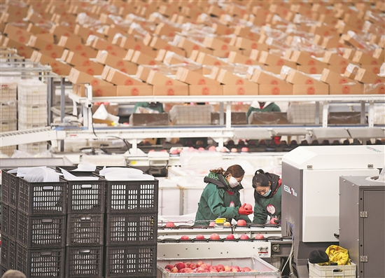 1月6日,在延安市洛川縣一家果業(yè)企業(yè),工作人員在生產(chǎn)線分揀蘋果。