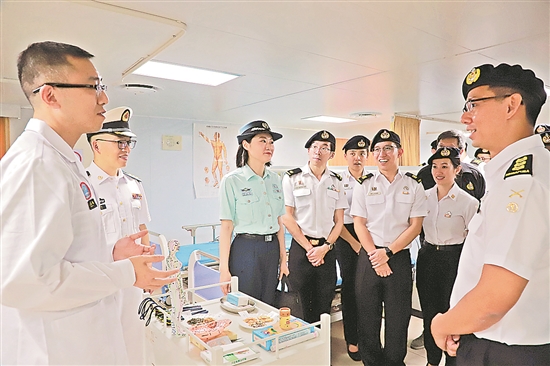 圖為近日,新加坡海軍醫(yī)務(wù)人員參觀技術(shù)停靠新加坡的中國海軍“和平方舟”號醫(yī)院船。新華社發(fā)(魏濤 攝)