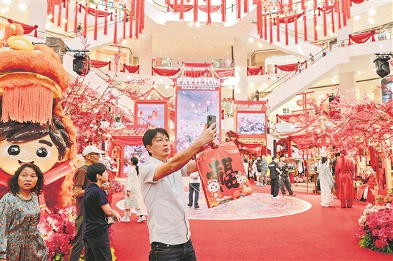雖然離春節(jié)還有一段時(shí)間,吉隆坡各大商場(chǎng)已布置得紅紅火火準(zhǔn)備迎接春節(jié)。圖為當(dāng)?shù)貢r(shí)間1月8日,馬來西亞,一位市民提著商場(chǎng)贈(zèng)送的“?!弊仲?gòu)物袋在吉隆坡PAVILION商場(chǎng)迎春布景前自拍。