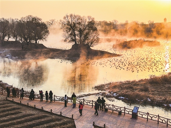 1月11日,市民游客在內蒙古自治區(qū)呼和浩特市大黑河郊野公園觀鳥。曾經大黑河流域生態(tài)環(huán)境遭到破壞,此地成為荒灘。近年來,當地實施多項生態(tài)修復措施,使之成為當地知名的觀鳥好去處。新華社記者 連振 攝
