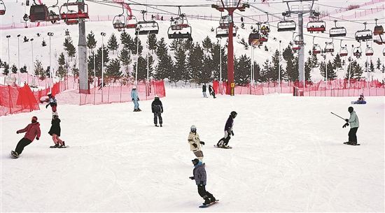 1月8日,滑雪愛好者在新疆阿勒泰市將軍山滑雪場的雪道上滑行。