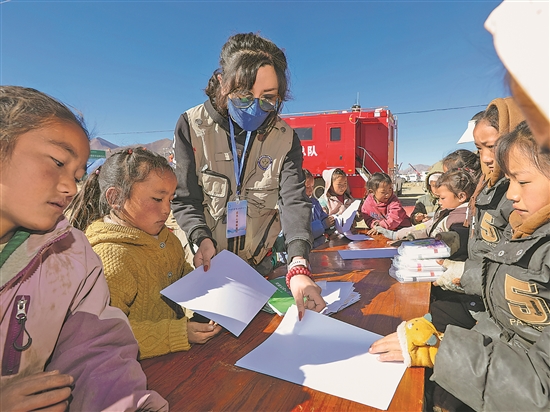 1月11日,在西藏自治區(qū)定日縣曲洛鄉(xiāng)措昂村的受災(zāi)群眾安置點,中國科學(xué)院心理研究所應(yīng)急心理救援隊的專家譚惜仁組織孩子們畫畫。在這里,譚惜仁等專家為孩子們進行心理疏導(dǎo)。