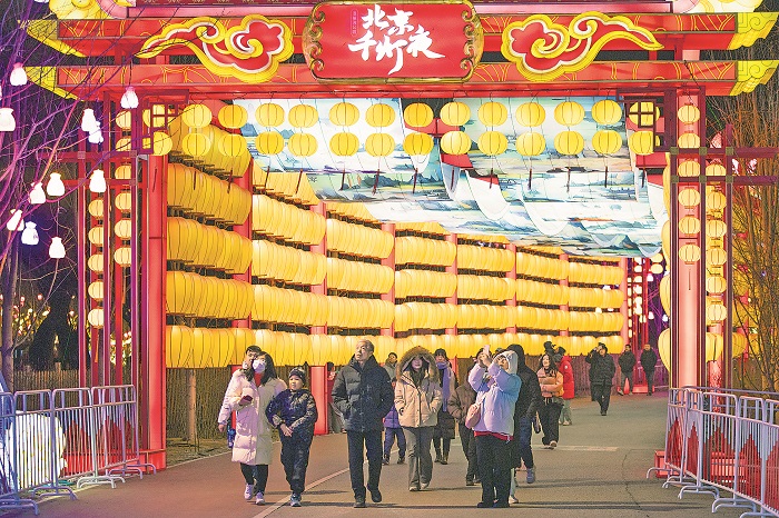 1月12日,北京溫榆河公園示范區(qū)西園“2025北京千燈夜”活動上,市民正在參觀。本屆“北京千燈夜”活動占地面積擴(kuò)大至600畝,用傳承千年的非遺技藝打磨出流光溢彩的奇幻世界,打造集“吃喝游購賞”于一體的夜游盛宴。