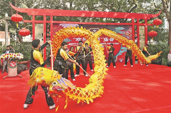 圖為近日,在孟加拉國(guó)首都達(dá)卡,表演者在“歡樂(lè)春節(jié)”廟會(huì)上舞龍。新華社記者 孫楠 攝