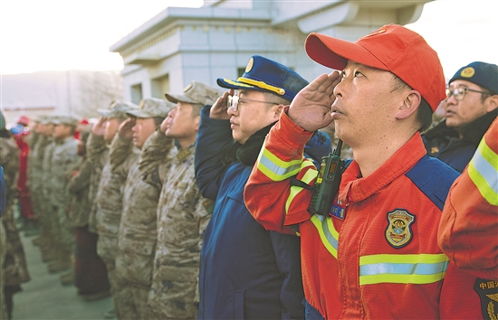1月13日上午9時(shí)30分,西藏定日6.8級(jí)地震遇難同胞悼念儀式在受災(zāi)最嚴(yán)重的長(zhǎng)所鄉(xiāng)舉行。參與救援的解放軍和武警官兵、消防救援人員、公安民警、醫(yī)護(hù)人員、青年志愿者及有關(guān)企業(yè)員工、干部職工、震區(qū)群眾代表數(shù)百人,脫帽肅立,向遇難同胞默哀3分鐘。