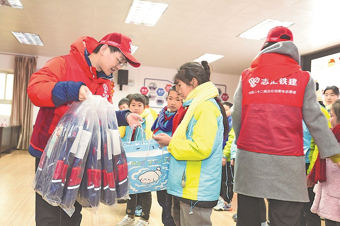 近日,中鐵二十二局五公司工會(huì)開展“冬日針愛”志愿行動(dòng),青年志愿者一針一線編織毛衣、帽子、圍巾、手套等,為農(nóng)村留守兒童送去溫暖與關(guān)愛。圖為志愿者為孩子們送上新年禮物和愛心織物。本報(bào)通訊員 唐海洋 攝