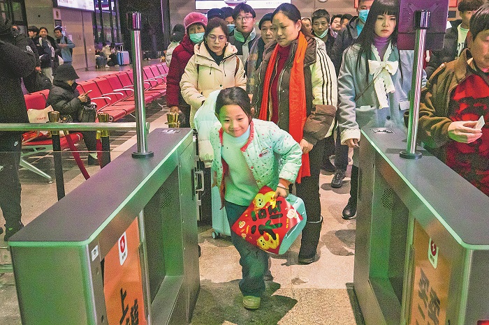 1月14日0時(shí)2分,隨著K4159次列車緩緩駛出北京西站,2025年春運(yùn)北京地區(qū)的首趟旅客列車正式啟程。圖為乘坐K4159次列車的小乘客檢票后通過閘機(jī)。