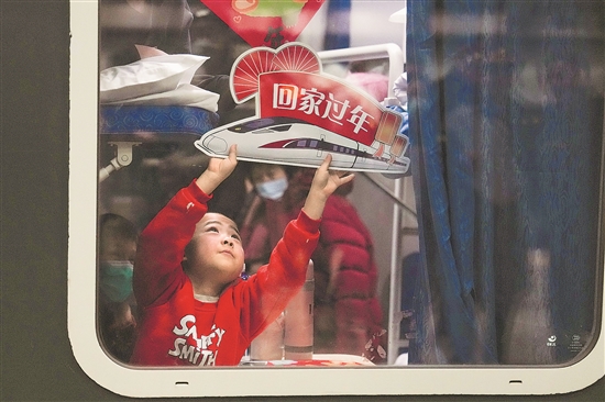 在北京地區(qū)春運首趟旅客列車K4159次發(fā)車前,一名小乘客拿著“回家過年”的標(biāo)牌在車廂內(nèi)玩耍(1月13日攝)。這趟北京西至合肥的列車于1月14日0時02分發(fā)車。