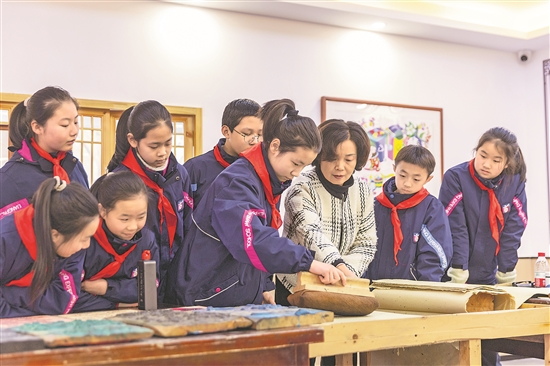 1月15日,在重慶市梁平區(qū)梁平實(shí)驗(yàn)小學(xué)少兒年畫館,梁平木版年畫市級(jí)代表性傳承人莫紹萍指導(dǎo)學(xué)生們學(xué)習(xí)梁平木版年畫的刷印。