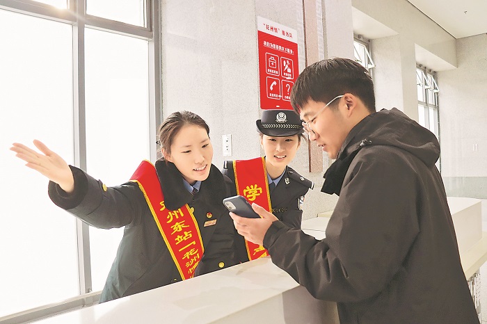 隨著春運(yùn)大幕拉開,洛陽鐵路公安處鄧州東站派出所積極應(yīng)對(duì)大客流,持續(xù)擦亮“雷鋒鐵警黨支部”黨建品牌,在進(jìn)站口設(shè)置青年突擊隊(duì)、便民服務(wù)臺(tái)等,開展各類便民利民服務(wù)活動(dòng),重點(diǎn)關(guān)注老年人、兒童及攜帶大件行李的乘客,做好購票指引、解答問詢、旅客幫扶等暖心服務(wù),全力確保群眾平安便捷出行。孫富常 攝