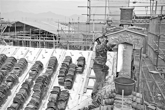 近年來,安徽省黃山市推動徽派古建創(chuàng)新發(fā)展,相關(guān)企業(yè)逐步發(fā)展壯大。目前,黃山市有仿古建筑營造、古建修繕保護(hù)利用、古建構(gòu)件配件生產(chǎn)、文創(chuàng)裝飾產(chǎn)品等各類企業(yè)307家,其中古建營造類、修繕類企業(yè)共183家,徽派建筑技藝從皖南山水間走向全國。圖為安徽省黃山市休寧縣一處傳統(tǒng)徽派古民居復(fù)建工地現(xiàn)場。新華社記者 張端 攝