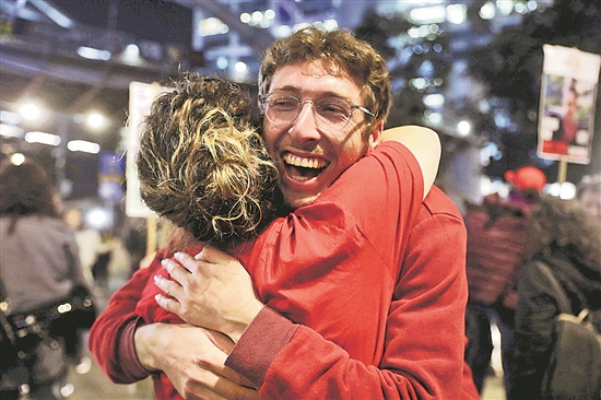圖為當(dāng)?shù)貢r(shí)間1月15日,在以色列特拉維夫街頭,人們擁抱慶祝協(xié)議達(dá)成。