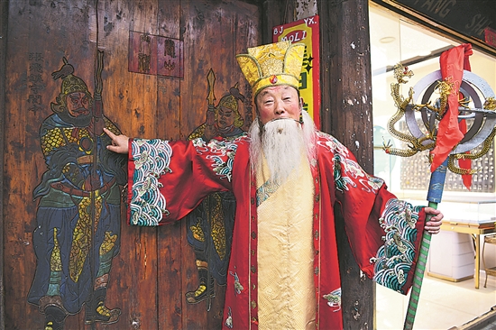 近日,在出門參加巡游前,張忠和介紹自家門神圖案。在閬中古城,不少居民家中都會(huì)選擇張飛和張憲兩位武將做門神。 “春到了,年到了,春節(jié)老人賜福了……”蛇年春節(jié)臨近,76歲的張忠和又迎來(lái)了一年中最繁忙的時(shí)候。