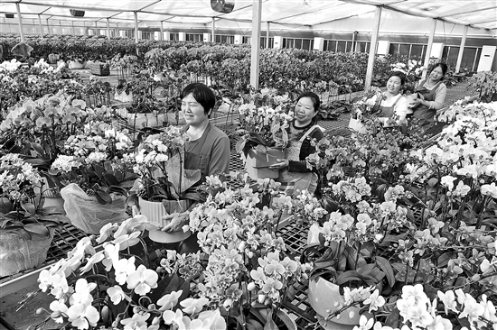 連日來(lái),在該公司智能溫室內(nèi),培育的紅色“大辣椒”“紅瑪瑙”“雪玉”等十多個(gè)品種近10萬(wàn)株蝴蝶蘭花卉長(zhǎng)勢(shì)喜人,員工們正忙碌著給蝴蝶蘭組盆、做造型、包裝,采取線上線下的方式銷售到全國(guó)各地,搶占春節(jié)市場(chǎng),目前該公司的蝴蝶蘭已被各地客商訂購(gòu)過(guò)半。