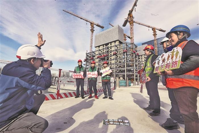 1月21日,在北京建工麗澤數(shù)字金融科技示范園項(xiàng)目施工現(xiàn)場(chǎng),來(lái)自該企業(yè)攝影協(xié)會(huì)的攝影師們?yōu)橐痪€工友拍攝紀(jì)念照。建筑工人、保安大叔、保潔阿姨紛紛變身“模特”,在自己建設(shè)的工地上留下美好的回憶。他們現(xiàn)場(chǎng)拿到裝裱好的照片,帶著這份“走心”的小年禮回家過(guò)年。本報(bào)記者 楊登峰 攝