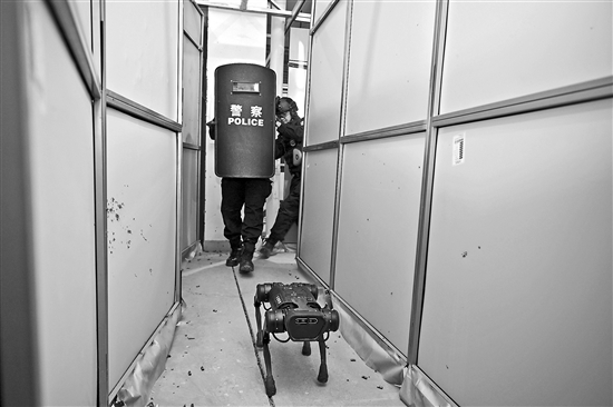 近日,在天津市公安局特警總隊(duì),特警一支隊(duì)隊(duì)員與機(jī)器犬配合演練。